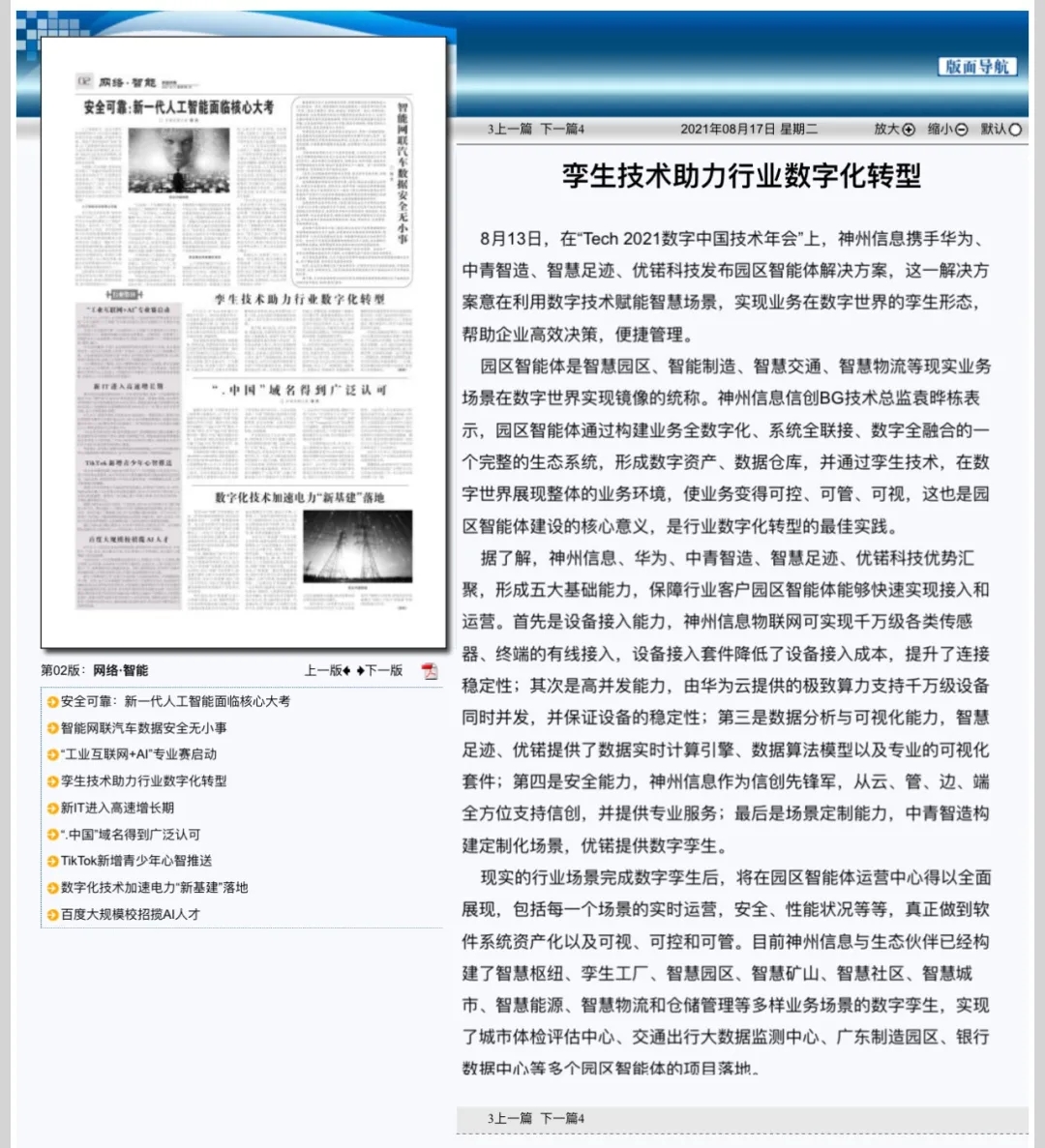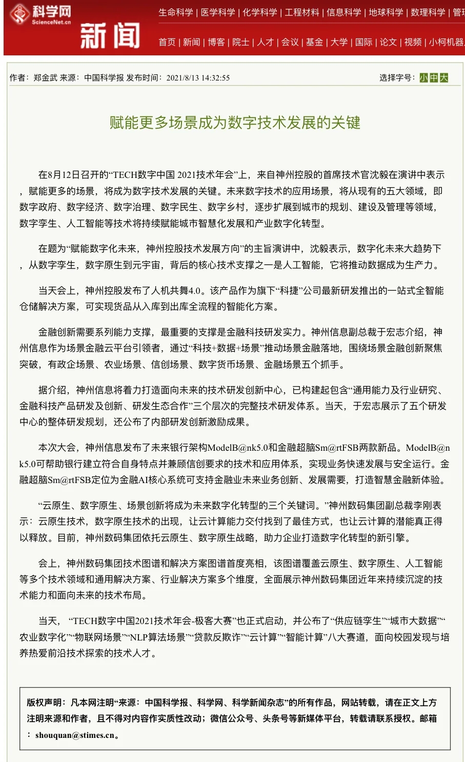 8月12日,由神州控股、神州信息、j9国际站集团联合主办的“科技自强、数据融通、场景创新——TECH数字中国 2021技术年会”云上盛大启幕,发布神州信创云、ModelB@nk5.0、金融超脑Sm@rtFSB、云原生数字化安全底座、园区智能体等重磅产品,国内各大权威、影响力媒体多角度多频次对盛况进行报道!