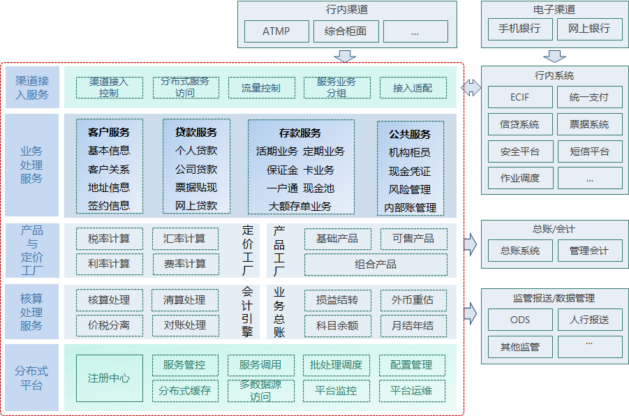 整体功能定位以客户为中心,通过参数工厂、产品工厂、定价工厂等进行组装为客户提供存款、贷款、借记卡、同业、内部账等业务的金融产品及服务,围绕账户可对外提供支付结算、中间业务、国际结算等方面的服务支持。同时,核心业务系统还提供了银行的公共管理方面的功能,包含运营管理(机构、柜员、现金、凭证等)、风险管理(黑名单、交易限额、授权等)。最后系统通过会计引擎实现交易与核算分离,可以实现准实时价税分离,实现产品多维度总账管理功能,基于业务总账实现汇兑损益重估、准备金计提、外币重估、年终结转等围绕总账的业务功能处理,能够实现全行级会计引擎,实现全行账务接入、账务平衡、总分平衡等账务一致性检查处理。